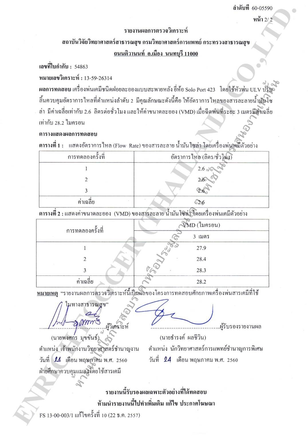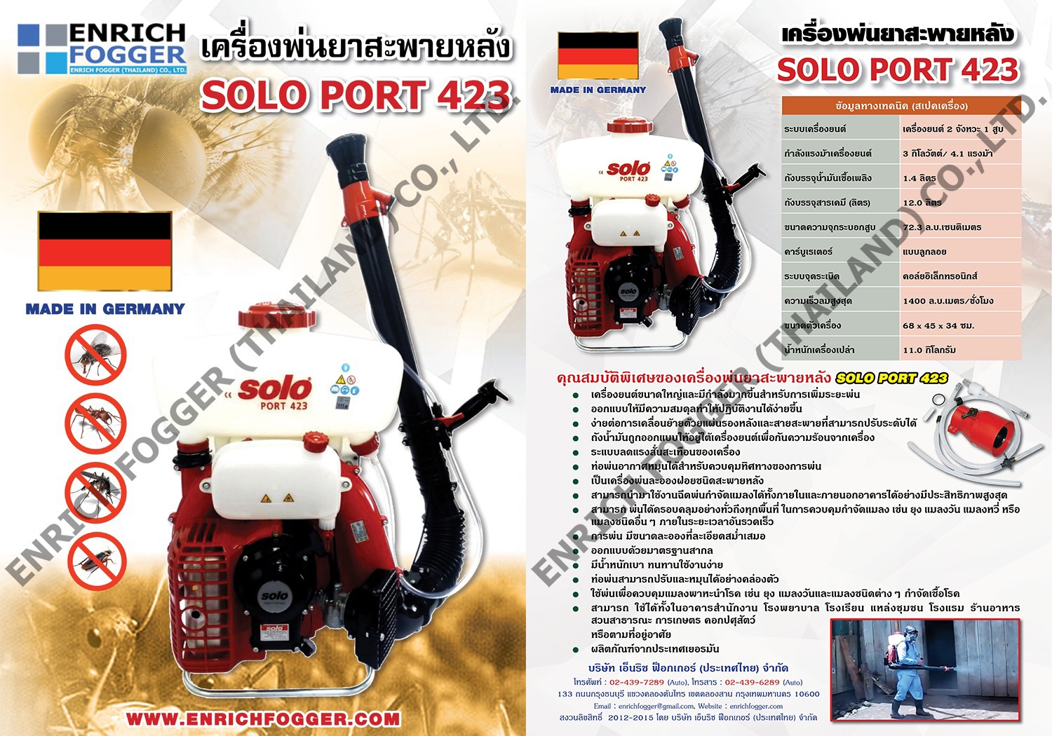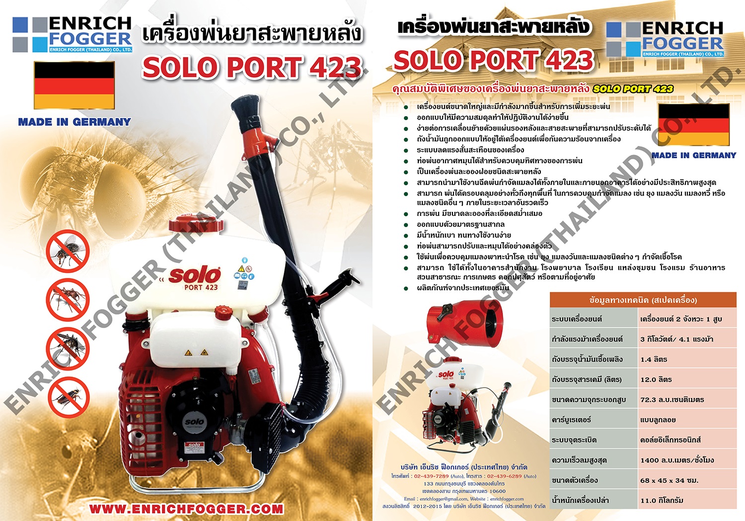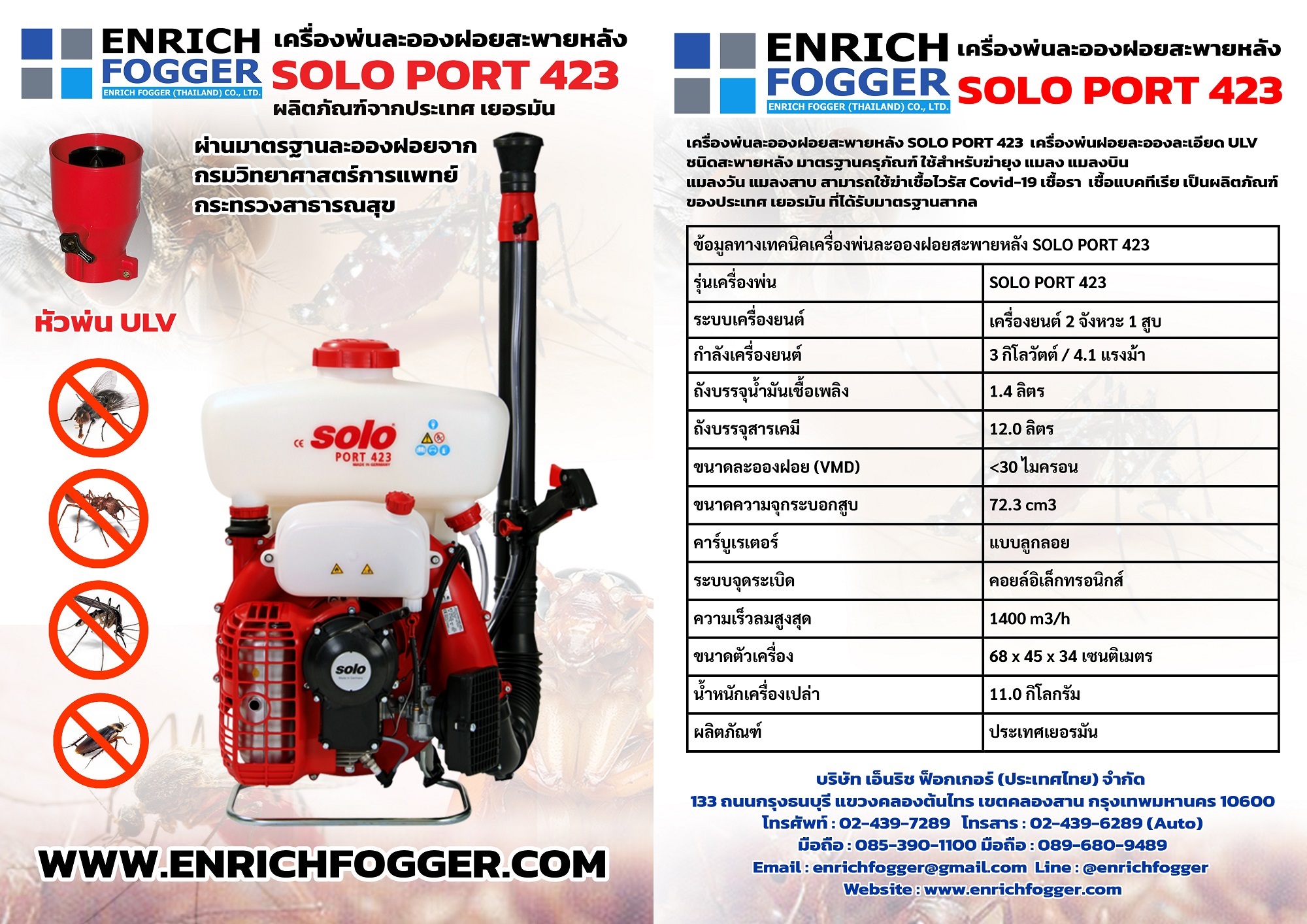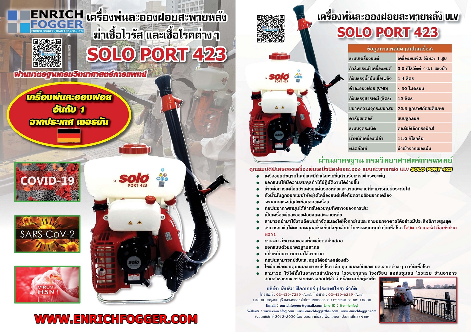 SOLO PORT 423 เครื่องพ่นฝอยละอองละเอียด ULV ชนิดสะพายหลัง มาตรฐานครุภัณฑ์ เหมาะสำหรับใช้ฉีดพ่นเพื่อฆ่าเชื้อไวรัส Covid-19 เชื้อรา เชื้อแบคทีเรีย เป็นผลิตภัณฑ์ของประเทศ เยอรมัน ที่ได้รับมาตรฐานสากล มเครื่องพ่นละอองฝอยละเอียด ULV สำหรับพ่นฆ่าเชื้อโรค เชื้อรา เชื้อไว้รัส หรือใช้พ่นฆ่าแมลงซึ่งเป็นพาหะนำโรค เช่นยุง แมลงบินและแมลงคลานในสถานที่ต่างๆ เช่น อาคารบ้านเรือน, โกดัง, สถานที่, โรงงาน, โรงแรม, โรงพยาบาล, ฟาร์มเลี้ยงสัตว์, เครื่องบิน, รถยนต์, และอื่นๆสามารถใช้ฆ่าเชื้อไวรัสและควบคุมการระบาดของโรคไข้หวัดนก (H1N1) การฆ่าเชื้อและป้องกันการระบาดของโรคหลังจากเกิดภัยพิบัติทางธรรมชาติ เช่น น้ำท่วม, แผ่นดินไหว เป็นต้น งานฆ่าเชื้อและการกำจัดแมลงในโรงงานอุตสาหกรรมอาหาร, โรงพยาบาล, ฟาร์มสัตว์, โรงเรียน, ห้างสรรพสินค้า, บ้านพักอาศัย และ อื่นๆเครื่องพ่นละอองฝอย เป็นเครื่องสเปรย์ ฉีดพ่นระบบไฟฟ้า ULV (Ultra Low Volume) ที่เป็นมิตร ต่อสิ่งแวดล้อมเหมาะสำหรับการใช้งานด้าน การฆ่าเชื้อโรค กำจัดแมลง การเกษตร และฟาร์มต่างในอาคารบ้านเรือน สถานที่ประกอบอาหาร และคอกสัตว์ใช้สำหรับฉีดพ่นยาฆ่าเชื้อโรค เหมาะกับสถานที่ต่างๆ เช่น โรงแรม โรงงาน โกดังโรงเรียน โรงพยาบาล ที่พักอาศัยร้านอาหาร รถยนต์ และฟาร์มต่างเครื่องพ่นละอองฝอย ใช้สำหรับฉีดพ่นสารเคมีกำจัดแมลง เช่น มด ยุง แมลงวัน ปลวก แมลงสาบ ไรฝุ่น เป็นต้นเหมาะที่จะนำไปใช้ได้ทั้งภายนอกและภายใน เช่น บ้านเรือน สวนอาหาร โรงเรียน โรงแรม โรงพยาบาล ห้องสัมมนาสามารถใช้ได้น้ำยาได้หลากหลายชนิด เช่น กลุ่มยากำจัดแมลงบิน แมลงคลาน ยุง มด มอด ปลวกแมลงวัน แมลงสาบ กลุ่มยากำจัดแบคทีเรีย เชื้อรา กลุ่มยากำจัดโรคระบาดใช้เพื่อควบคุมโรคติดต่อและพาหะ ป้องกันและกำจัดศัตรูต่างๆ ที่เป็นพาหะนำโรคสู่คนและสัตว์เลี้ยง เพื่อใช้ในการป้องกันสินค้าที่เก็บในห้องเก็บของ ในโรงงาน และโกดังที่เก็บผลผลิตทางการเกษตร และอาหาร เพื่อใช้ในการป้องกันพืชผลทางการเกษตร ที่ปลูกในไร่ สวน แปลงผัก และในเรือนเพาะปลูก เพื่อใช้ในการป้องกันไข้หวัด เชื้อไวรัสต่างๆ ในโรงเรียน โรงพยาบาล โรงภาพยนตร์ และอื่นๆมีวิธีการใช้งานที่ง่าย น้ำหนักเบา และมีเสียงเบา เหมาะสำหรับเจ้าหน้าที่สาธารณะสุข หรือ บริษัททำความสะอาด สามารถใช้ได้น้ำยาได้หลากหลายชนิด เช่น กลุ่มยากำจัดแมลงบิน แมลงคลาน ยุง มด มอด ปลวกแมลงวัน แมลงสาบ กลุ่มยากำจัดแบคทีเรีย เชื้อรา กลุ่มยากำจัดโรคระบาด เช่น ไข้หวัด 2009 ปากเท้าเปื่อยสามารถใช้ได้กับกลุ่มการเกษตร เช่น กำจัดแมลง พ่นปุ๋ยชนิดน้ำ ก